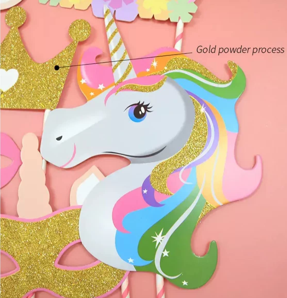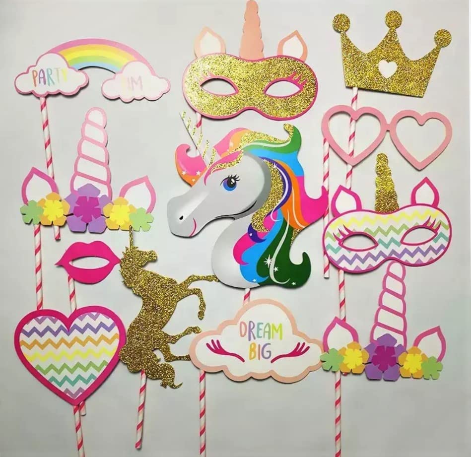 About this item FUNNY PINK&GOLD UNICORN PHOTO BOOTH PROPS Includes 12 pcs konsait custom-made glitter Unicorn photo booth props birthday in different design,rainbow unicorn horns, ponytails, stars, rainbow with clouds, magical speech bubbles and more,Super fun for unicorn party baby shower or birthday party supplies for girls adults kids children,shine brightly in your party gathering UNICORN PHOTO ROPS EASY ASSEMBLE IS NEEDED ] Simply attach the included bamboo dowels to each Rainbow unicorn pegasus photo booth props using the pearl beads glue and 3M adhesive tabs(usage refer to the image), Then hold the prop in front of your face, over your head, etc. take a photo what you want anytime, anywhere. [ UNICORN PARTY FAVORS PHOTO BOOTH FOR GIRLS KIDS ] Highly recommended assemble this Unicorn gifts photo booth in advance, place unicorn party props in a mason jar as a fun table decoration until guests are ready to use.everyone will love the funny faces on these unicorn birthday photo booth props. Take entertaining and Unicorn baby shower supplies party photos of your friends and family while making memories with these stylish photo booth props!